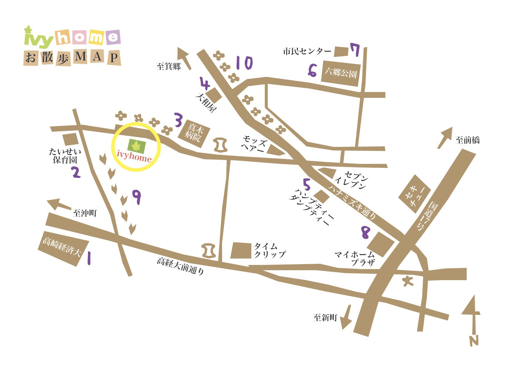 | 車利用の方 | 関越自動車道前橋ICをおりて国道17号線を高崎市街方面へ、並榎町交差点を右折(15分)そのまま直進し、右手にセブンイレブン左手にモッズヘアが有る交差点を左折(1分)約350m先の右手に真木病院が見えます。そのまま道なりに真木病院より約150m進むと左手にアイビーホームのグリーンの看板が見えます。 ※駐車場は当社前面の2台分になります。 |