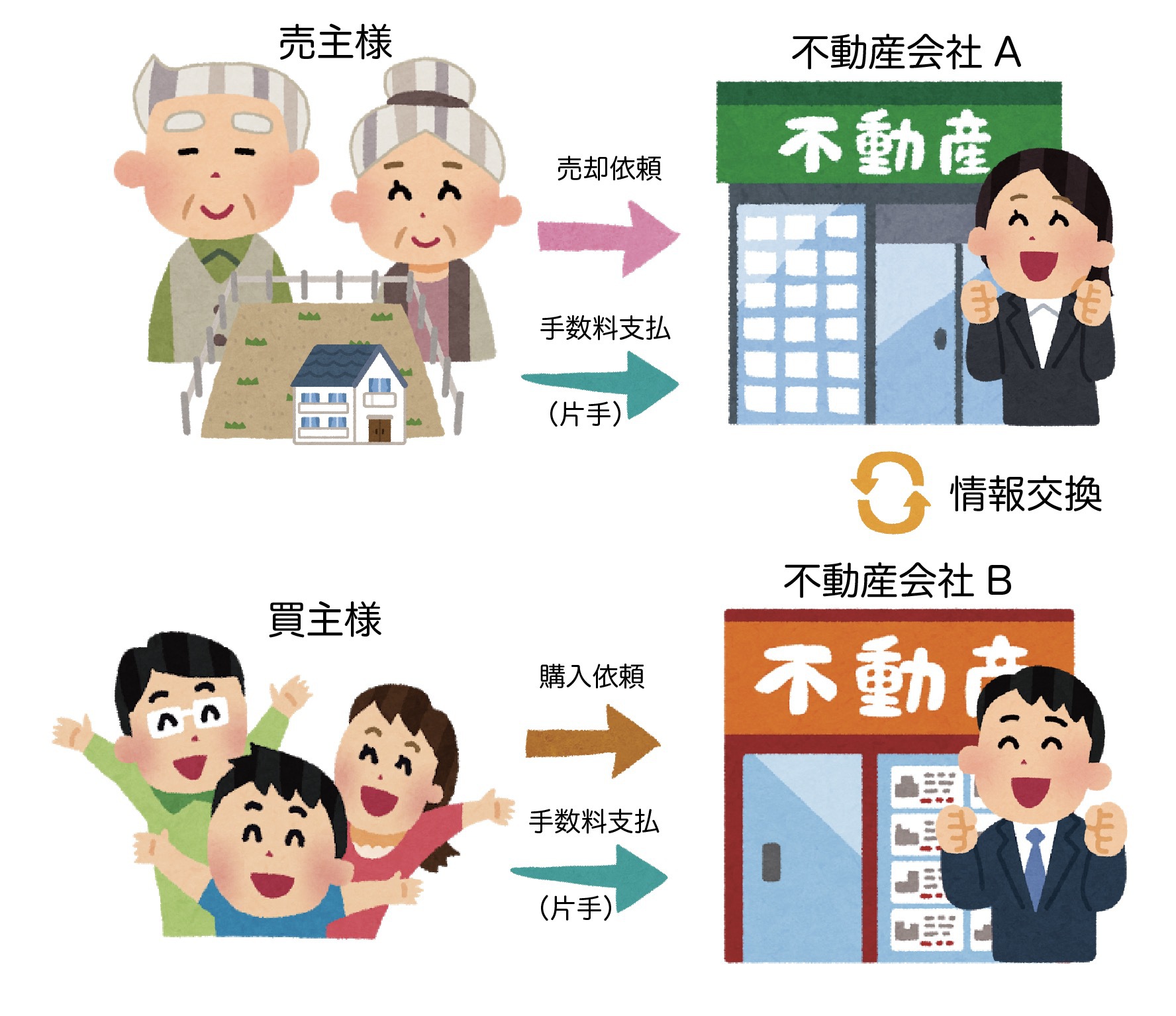 一般的にはパターン1のように売主様から依頼を受けている不動産会社Aが上限金額の半分(片手)を売主様から支払って頂き、買主様から依頼を受けた不動産会社B が買主様から上記上限金額の半分(片手)を買主様から支払って頂くのが一般的です。
